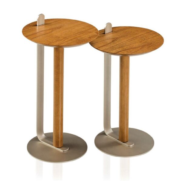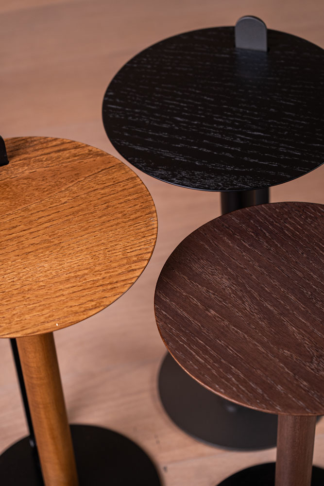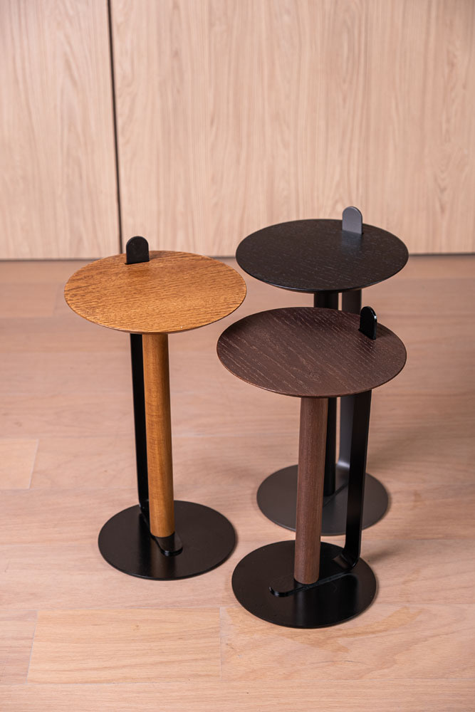Un dúo de mesas auxiliares con una estética primordial, inspirado en la visión minimalista y funcional del diseño japonés: menos es más. La base combina metal y madera, sosteniendo una tapa de MDF laminado en madera de cinamomo. Una lámina metálica sobresale de la tapa para facilitar su transporte.