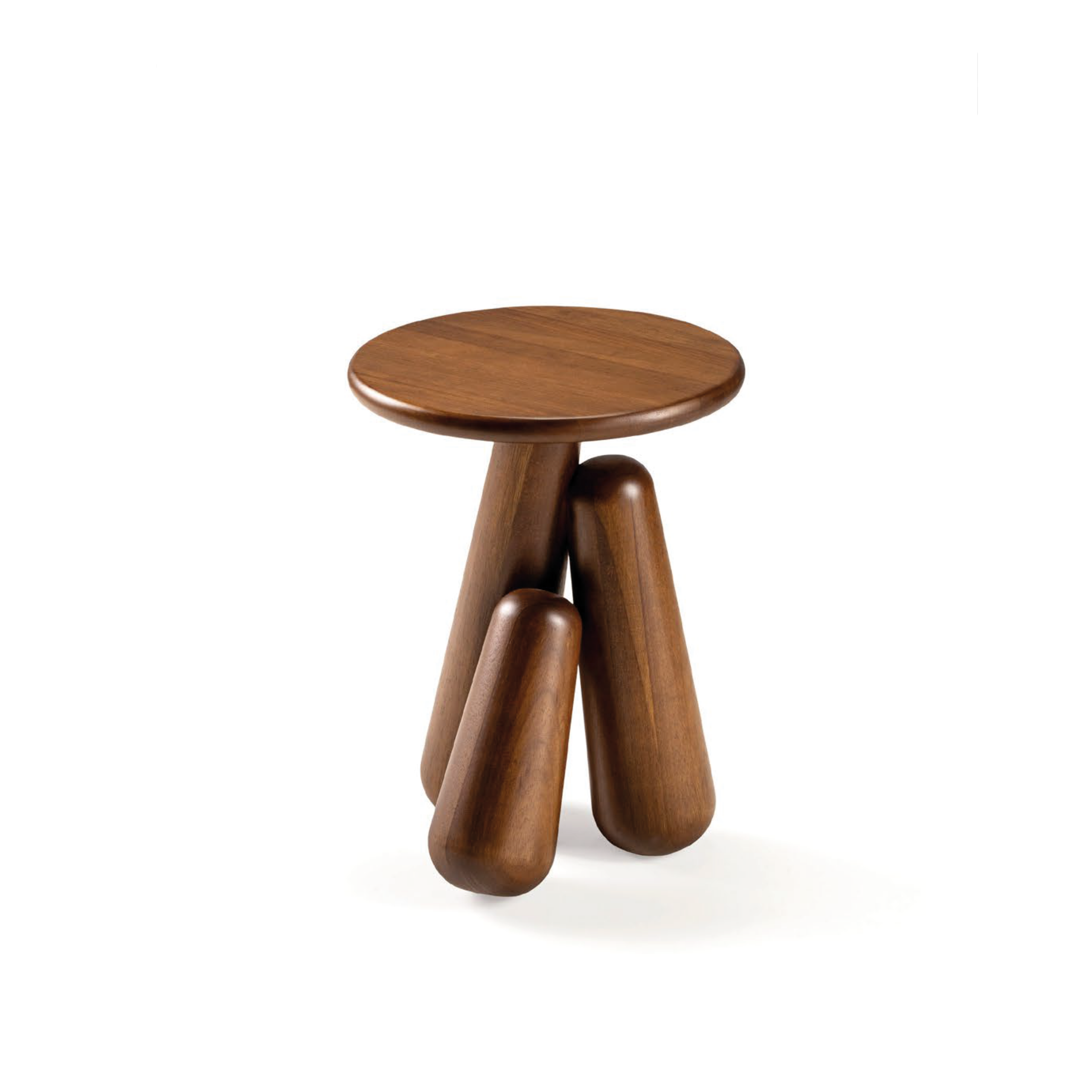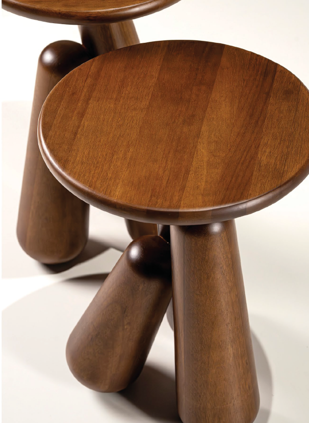 La mesa Parioli se apoya sobre tres patas torneadas en distintas alturas, creando un diseño diagonal que parece danzar y evidencia el cuidado dedicado a la madera.