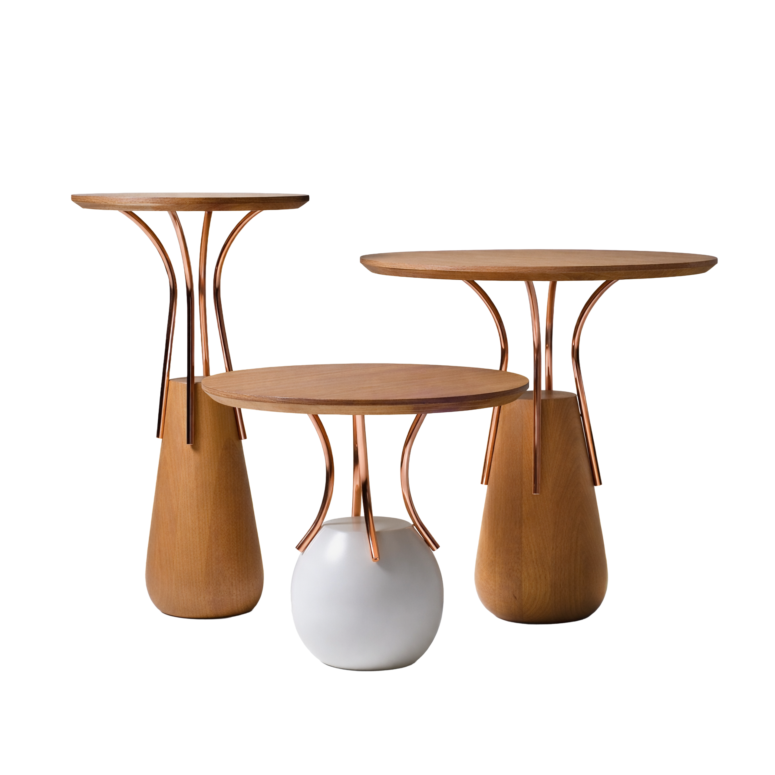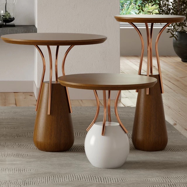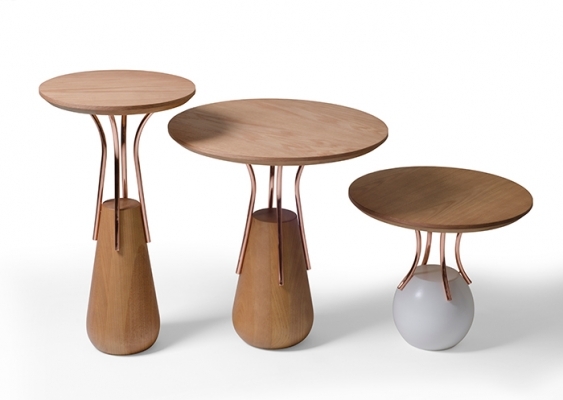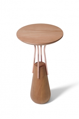 Colección de mesas lúdicas y sofisticadas, las mesas Sorrento se inspiraron en los famosos vasos marajoaras y en la forma de las palmeras de la región de Pará. El volumen de la madera torneada está envuelto por tubos de cobre, aportando ligereza y refinamiento a la pieza.