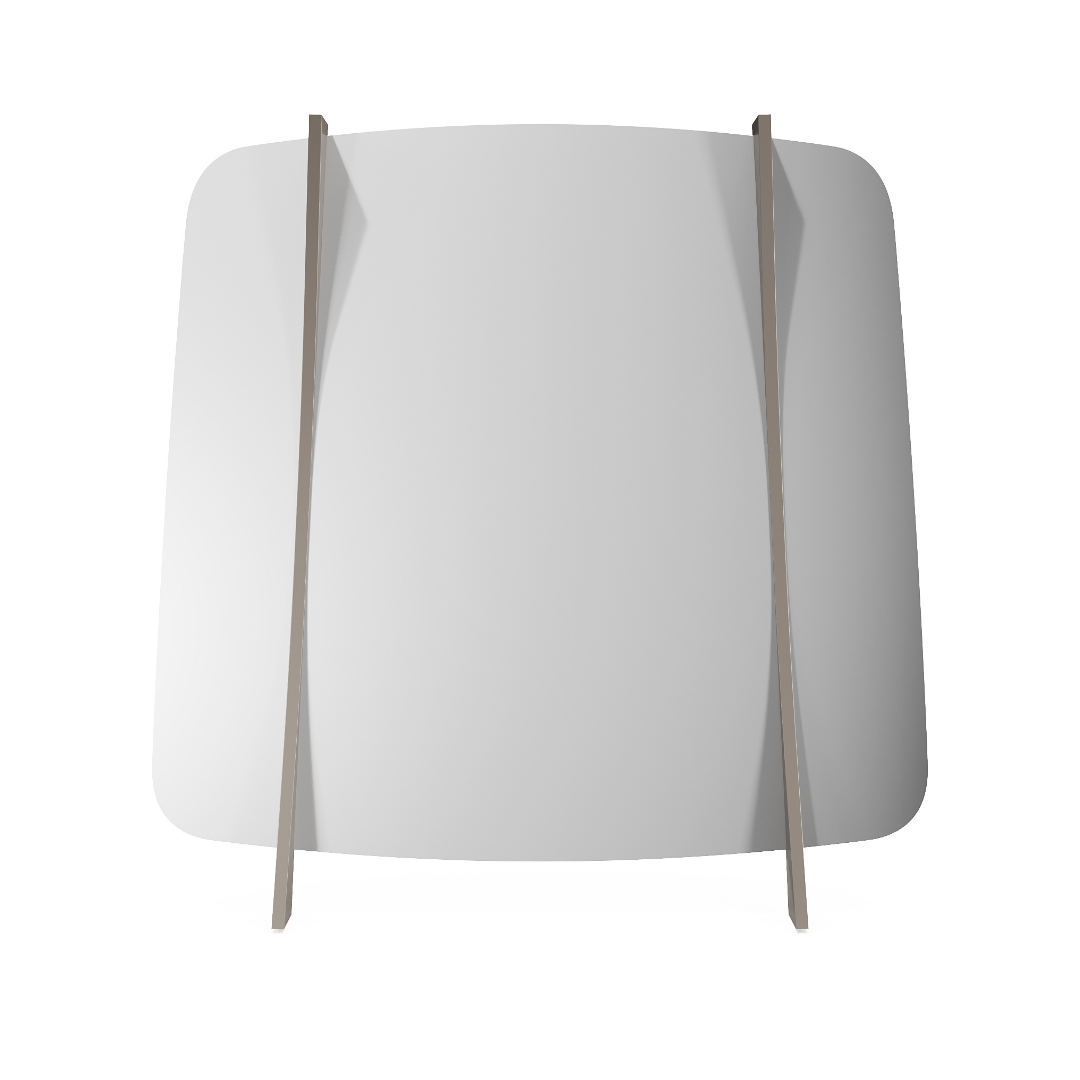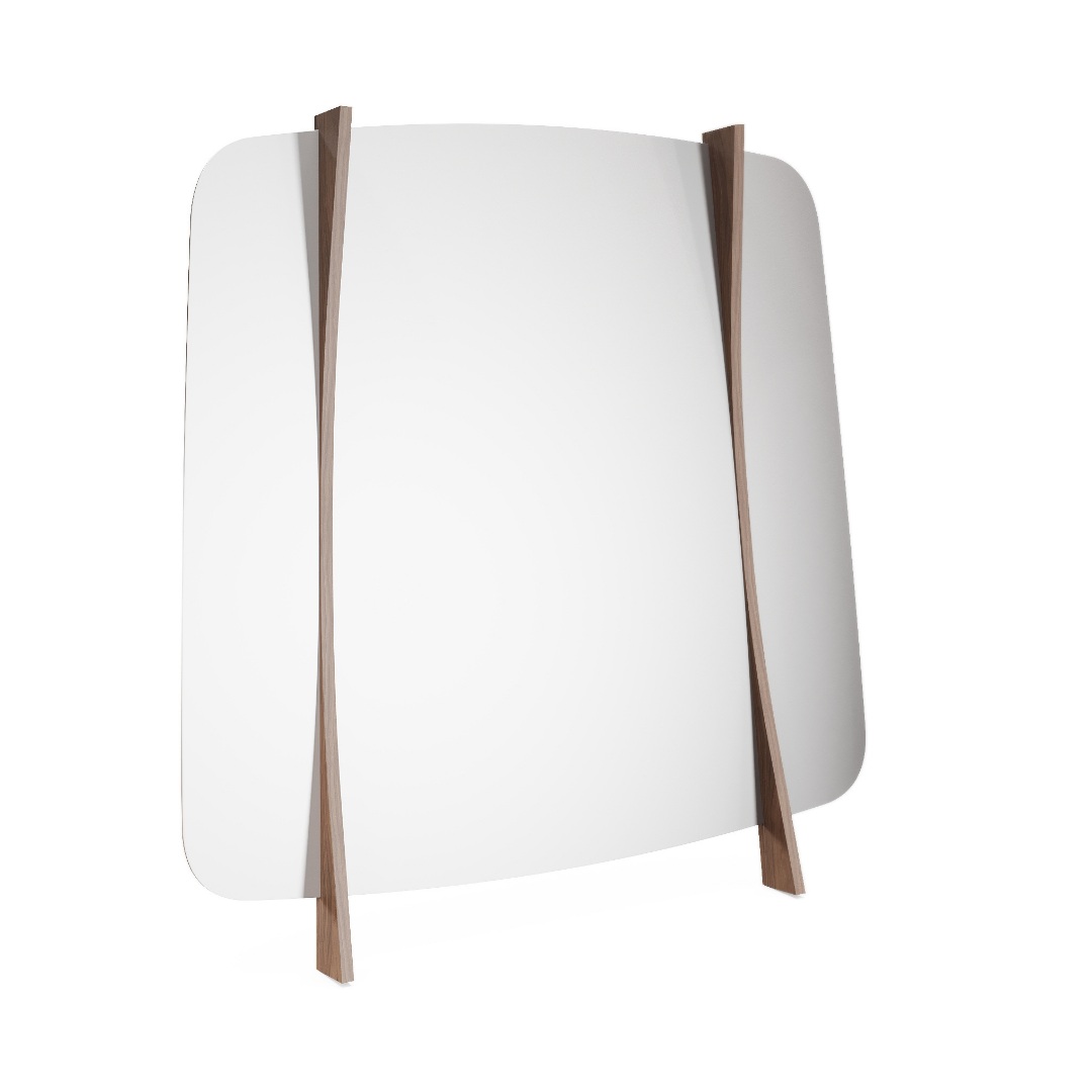 El espejo Di Sanzio cuenta con dos columnas verticales de madera que crean un arco sutil, proporcionando un contraste armonioso entre la estructura sólida y la delicadeza del reflejo.